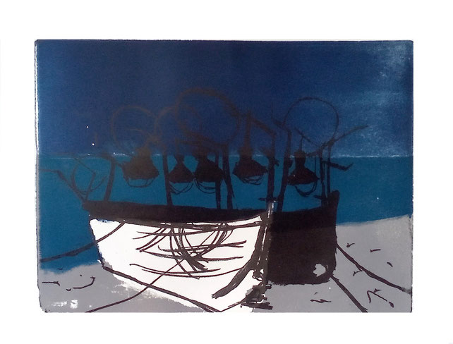 © Schidlo 2025; Spanische Fischerboote (nach einer Idee von John Eaves); Lithografie, Tusche- und Kreidezeichnung in Grau, Blau und Schwarz gedruckt